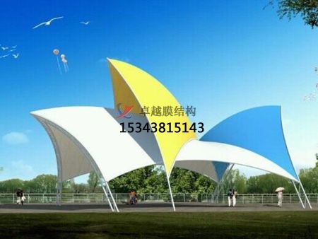 膜結(jié)構(gòu)景觀一般分PVC、PTFE和ETFE膜三大類。PVC膜是以聚酯纖維作基材,覆以PVC形成的;PTFE膜材的基材是玻璃纖維;而ETFE膜則是沒有基材,直接成膜。
