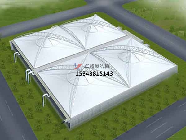 2、我公司利用膜結構的輕巧,別致的造型建造各種半封閉,全封閉的不行空間;污水池反吊膜結構中的高強度柔韌薄膜稱膜材,它是一種耐腐蝕、耐高溫、耐久用、高強度的樹脂類涂層織物,由多種復合PVC樹脂涂層刀刮成型,具有質地柔韌、厚度小、重量輕、透光性好的特點。對自然光吸收和透射能力、阻燃,具有良好的耐久、防火、氣密等特性;表面經過特氟龍處理或二氧化鈦抗老化處理,具有較高的自清潔性能。下面就大家介紹一下我公司在泰安市地區完成的部分污水池膜結構封閉項目。